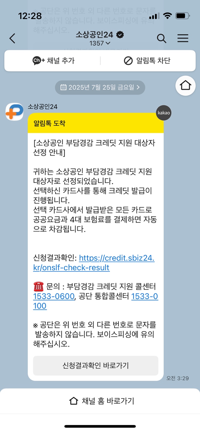 신청은 소상공인 24 홈페이지나 부담경감크레딧.kr에서 가능했습니다. 카카오톡 로그인인증으로 바로 했어요
