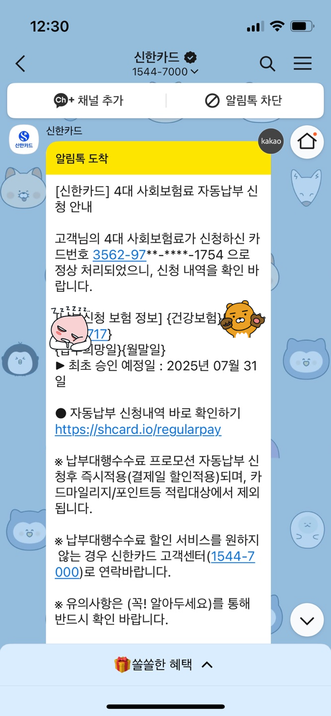 이렇게 대상자로 선정되면 카톡이 옵니다! 저는 신한카드로 신청을했는데요-